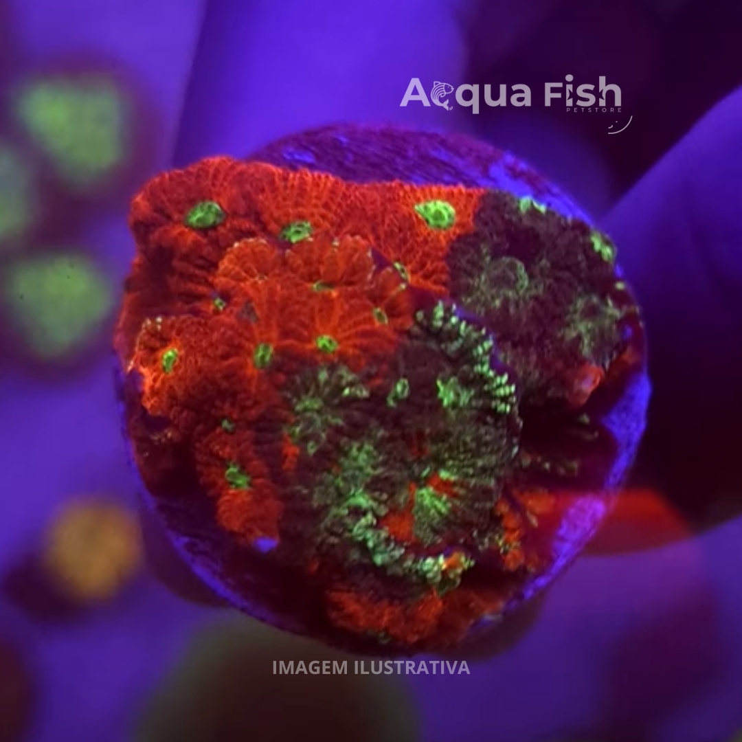 O Favia War Coral é um LPS (Large Polyp Stony Coral) de coloração intensa e padrão marcante, famoso por sua combinação vibrante de vermelho profundo com centros verdes ou azulados. Esse contraste o torna um dos corais mais chamativos e desejados entre os LPS.