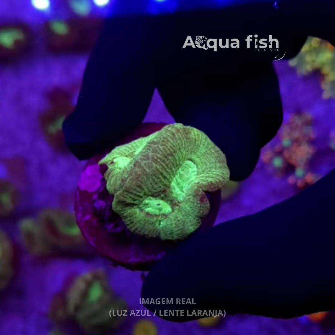 Favites Dragon Soul é um coral LPS (Large Polyp Stony) altamente valorizado por sua coloração vibrante e padrão marcante em forma de colmeia. Cada pólipo apresenta uma combinação intensa de centros verdes fluorescentes, borda amarela ou laranja brilhante e divisões azul-escuras ou roxas, criando um contraste visual impressionante que se destaca sob iluminação actínica.