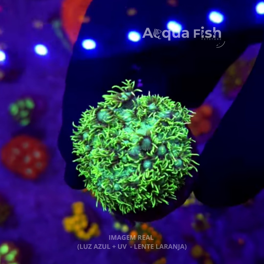 O Golfball Metallic Green é um LPS (Large Polyp Stony Coral) de formato arredondado e compacto, conhecido por sua coloração verde metálica intensa e pólipos curtos e densos que lembram pequenas flores. Seu aspecto esférico e textura única o tornam um ponto de destaque em qualquer aquário reef, especialmente sob iluminação azul, onde seu brilho se intensifica.