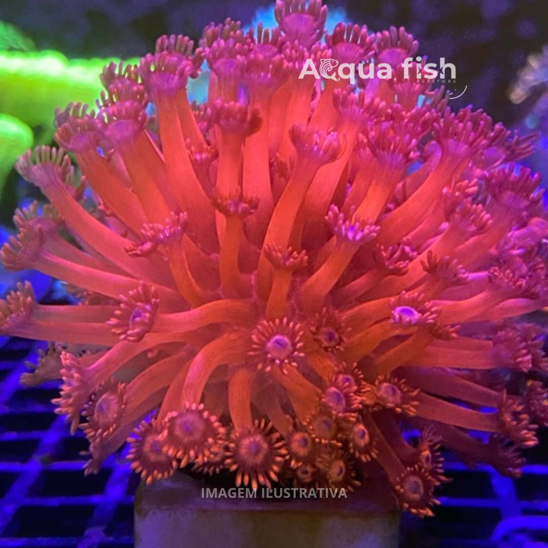 A Goniopora Red é um coral LPS de grande destaque no aquarismo marinho, conhecido por sua coloração vermelha intensa e seus longos pólipos que se movimentam suavemente com a correnteza, criando um efeito visual hipnotizante no aquário.