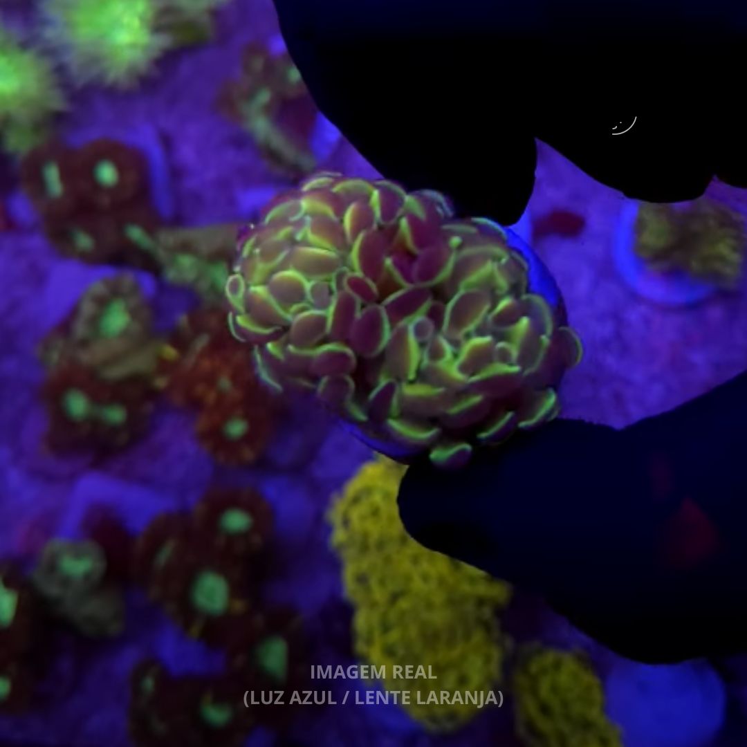 O grande destaque dessa variedade é o efeito visual holográfico presente em seus tentáculos, que refletem diferentes tons sob iluminação azul ou actínica, criando um brilho único e hipnotizante. Esse efeito transforma o coral em um verdadeiro ponto focal no reef.