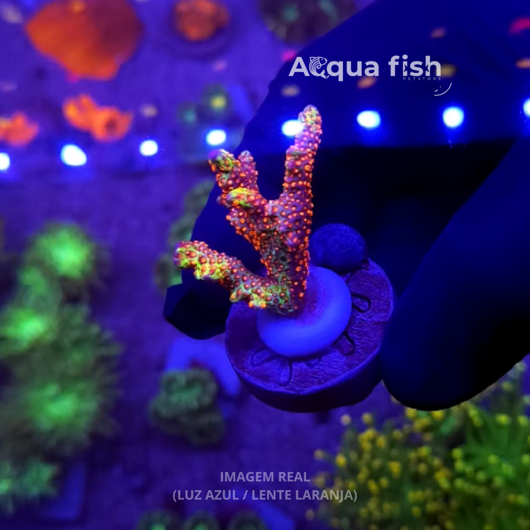 A Montipora Forest Fire é um coral SPS muito procurado por sua coloração vibrante e alto valor ornamental. Sua base verde intensa contrasta com pólipos em tons de vermelho a laranja, formando um visual marcante que se destaca facilmente no aquário.