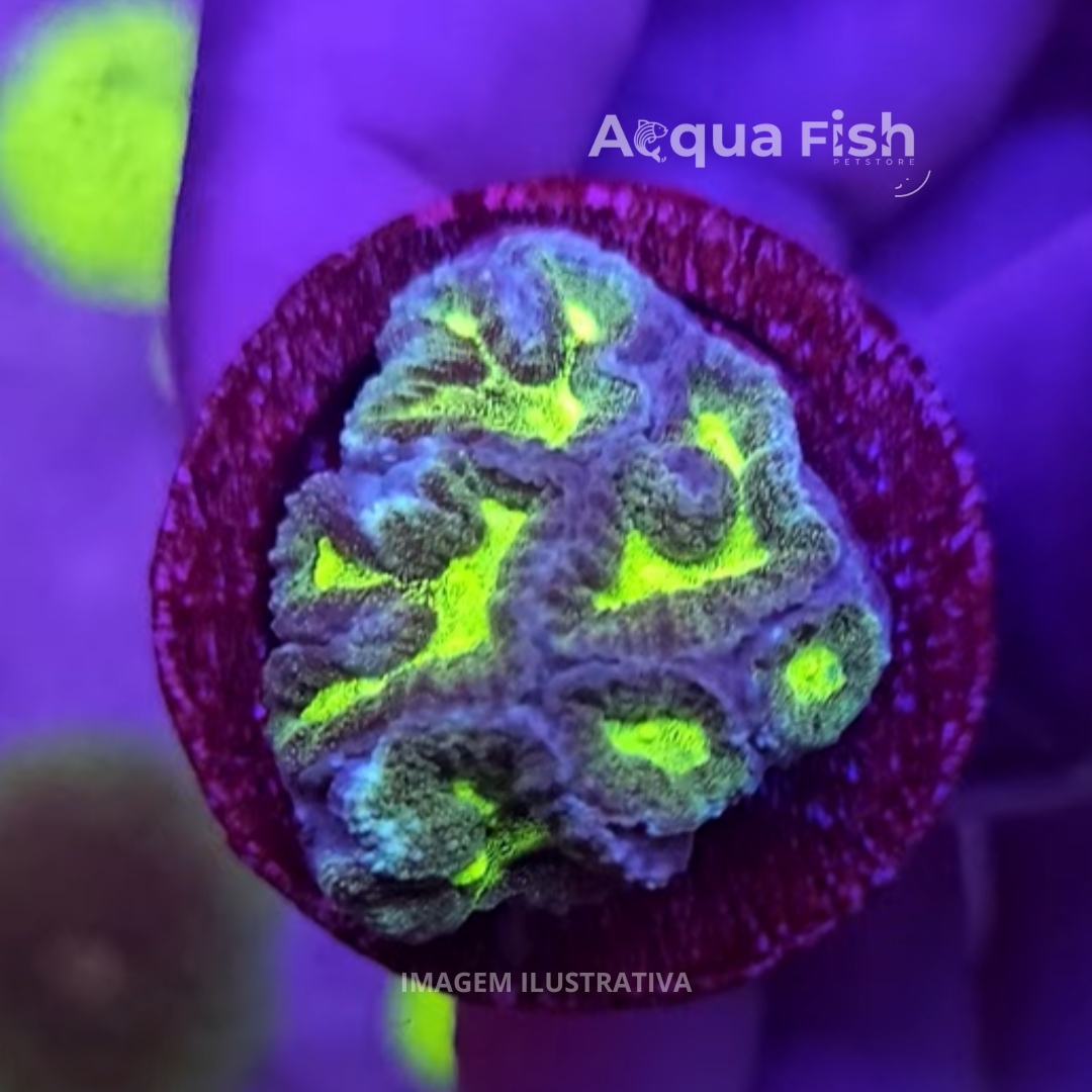 O Platygyra Green é um coral LPS (Large Polyp Stony Coral) conhecido pelo seu aspecto labiríntico e coloração verde fluorescente que se destaca intensamente sob luz azul. Sua estrutura com canais sinuosos e relevos marcados o torna um coral de destaque visual e textura única em qualquer aquário de recife.